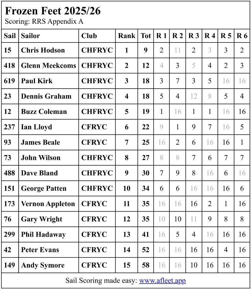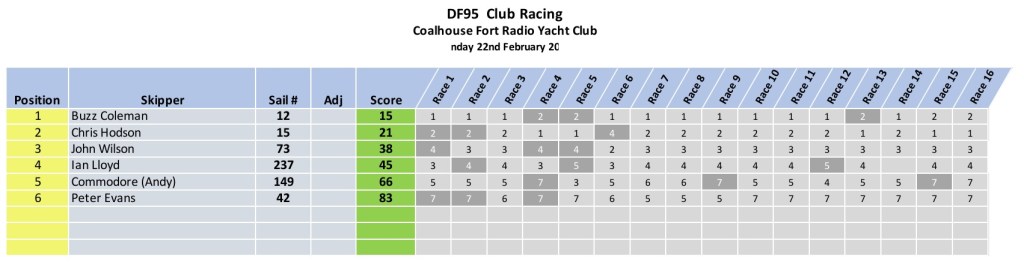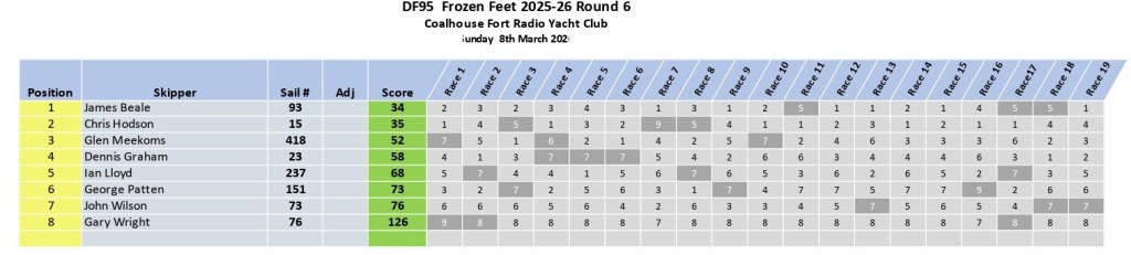 This winter series seems to have flown by, and with just one round remaining for the 95s, this result has tightened things up nicely at the top of the championship table. A huge thank you to all who supported the event and contributed to such enjoyable racing, sailed throughout in great spirits. GM.