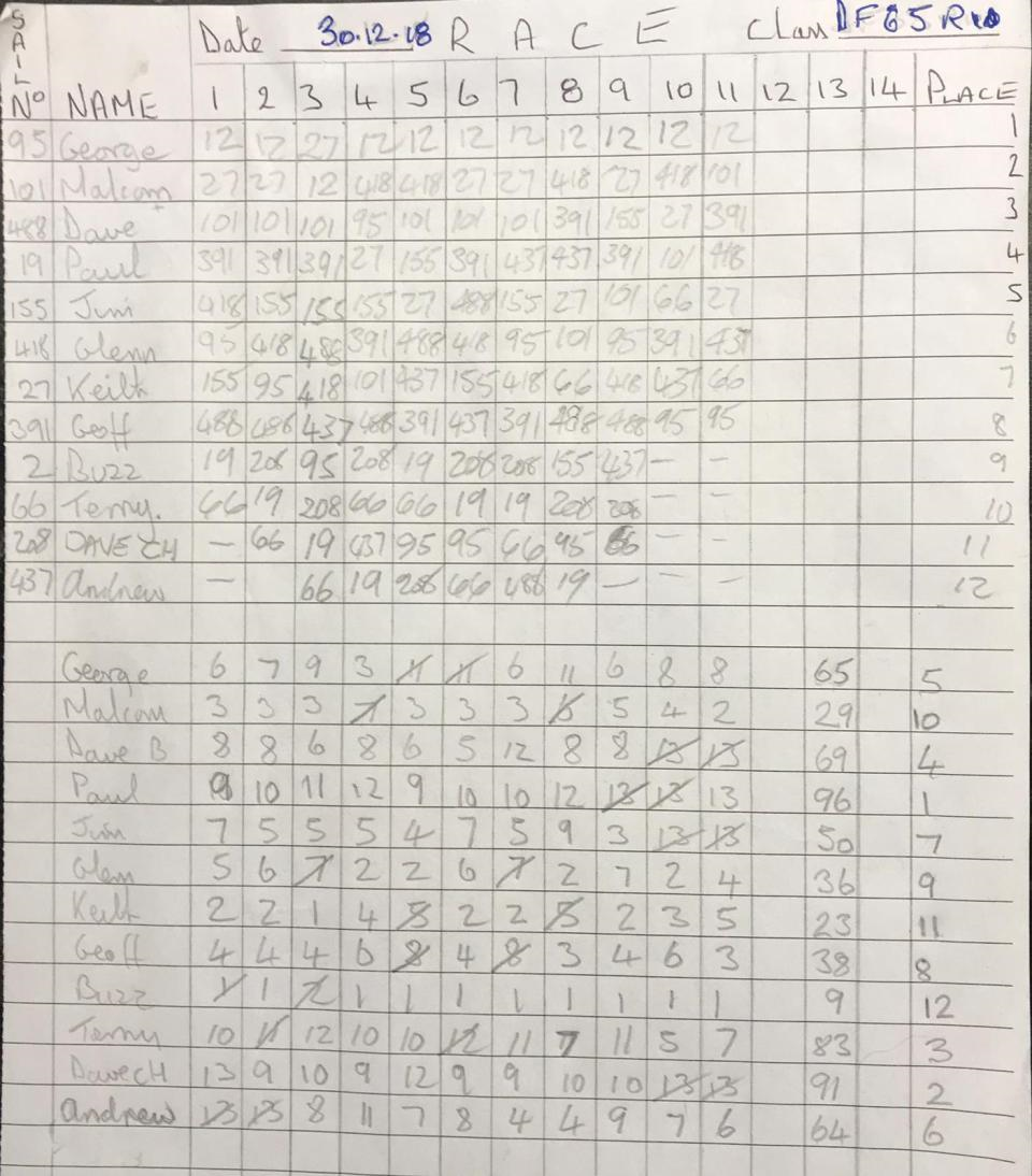 Sunday 30.12.18 DF65 Final Round of the Autumn Series.Wind SW 3-5 mph Temp 12’ and dull.The course was set at Start 8&9,12p,9p,12p,9p & finish 12& Flag. After a huge wind shift the course was altered to 8&9 start 6p, 9p, 6p, 9p and finish 5&6. Today we had 12 skippers 10 on A+ 2 on A and we managed 11 races from 10.10 till 1.40, pleased to say we had no breakdowns, but then James wasn’t there. Not the most exciting days racing with the wind catshiting everyone out at sometime or other, even Buzz struggled to cross the finish line on one occasion, however it didn’t stop him from running away with the day on 9 points from a very valiant effort from Keith on 23 points and Malcolm in a solid 3rd on 29 points