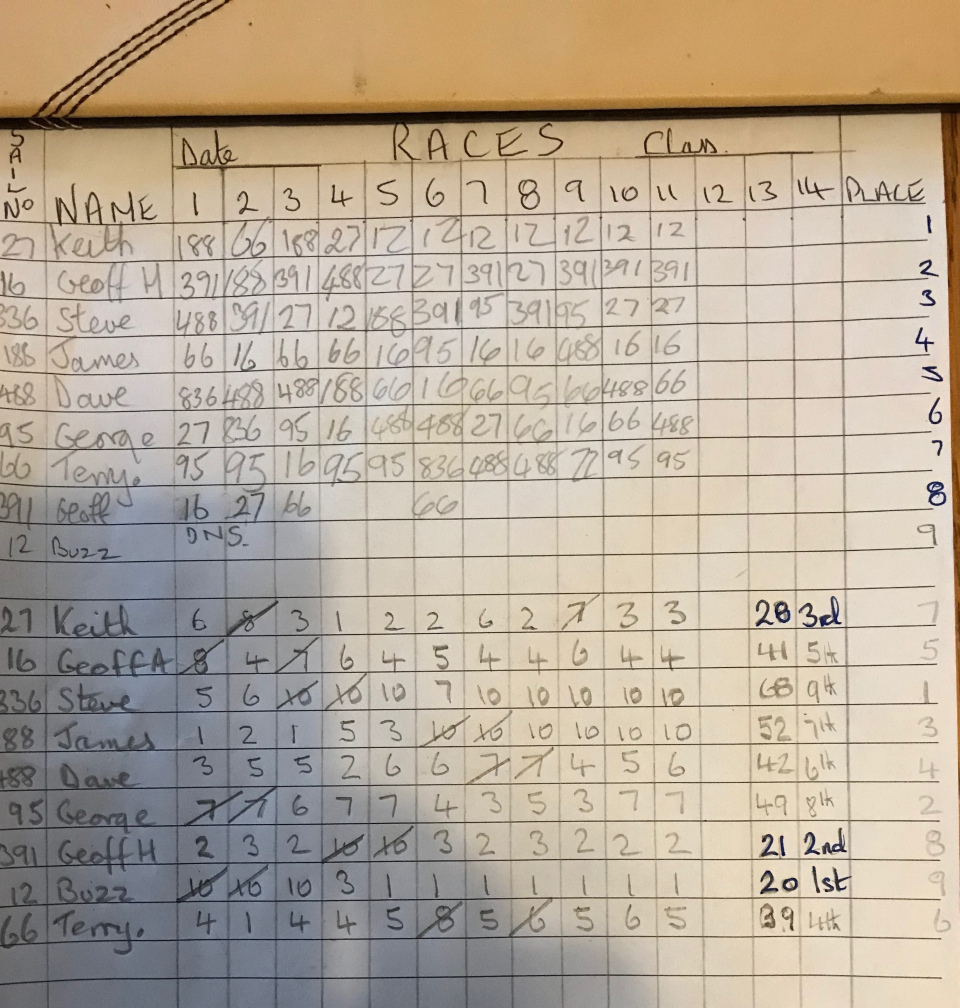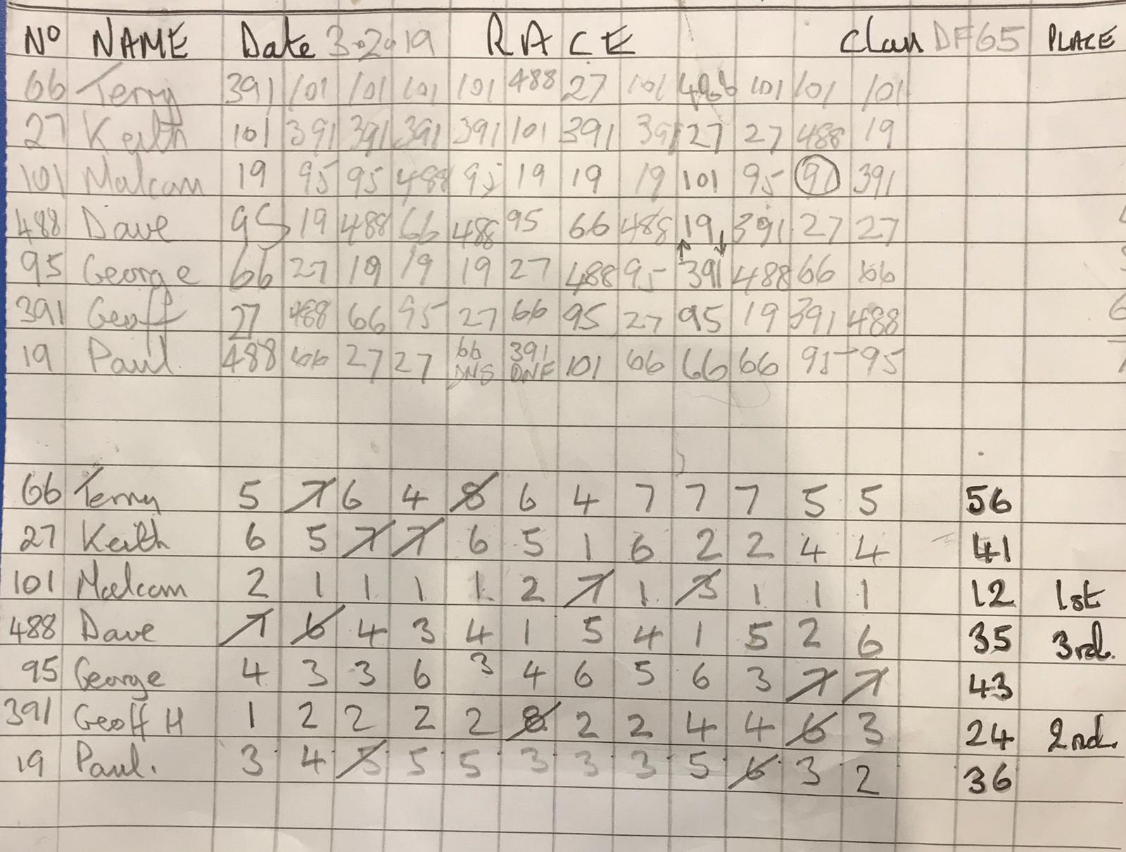 Wind somewhere between 0-1 mph until 12o/c then 6 mph and constant Temp a sunny 7-8’. We had 6 skippers all onA+. A difficult day to set s course but we settled on a Start 11 & 12, 7p, 11p and finish 7 &8 and despite the slow start to the day we got in 16 races. That was with only 3 races up to mid day , pleased to say no breakdowns, there was however a fare amount of hustling going on at all the marks but then always sorted out amicably . Our new boy Paul took a shine to mark 7 and then started on 11 but I think he got it out of his system. Anyway Jonny had things under control and took the honours with 25 points from Paul on 32 & Geoff on 33 debuting he’s new baby . I’m glad our patients prove worth while at least the last dozen races were good. NB a reminder it’s IOMs next week