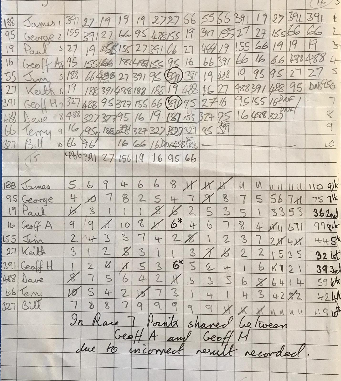 It was a mixed bag of results overall, and no obvious winner emerged until the scores were tallied. Despite his strong afternoon, Dave’s charge wasn’t quite enough to overhaul the others. John narrowly pipped Phil by a single point, despite winning one fewer race, and, despite a quieter afternoon, Glenn managed to sneak the overall win.