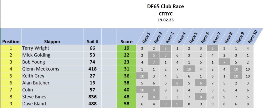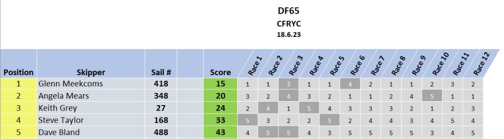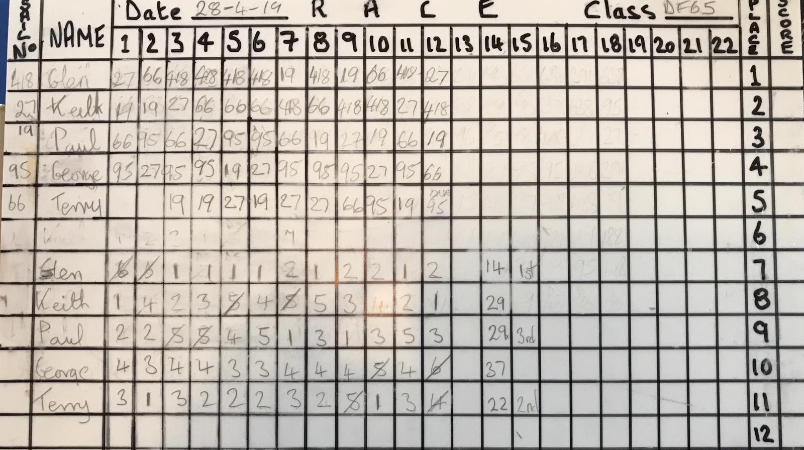 DF65 Club day Wind North West anywhere from 5 to 14 mph and moving around like you wouldn’t believe Temp 10’ and showers 5 skippers for 12 races on A+, A and B ( A+ the one to be on all day) that 3 skippers started on , a course was set with the start at 6 and the Flag , 1p,Xp, 1p, Xp and finish at 1 and the Flag, Glen kicked the day off by hot wiring his tranny battery from his car, and Paul and Keith finally gave in and changed rigs. I think it’s fare to say everyone got caught out at sometime or another ending up in irons ( a Paul) but we did have some close finishes and a proper good days sailing.Glen always had control of the outcome to win on 14 points from Terry in second on 22 points and Paul in third on 29 points beating Keith on count back. NB don’t forget it’s baby dragons 🐉 next week 😘