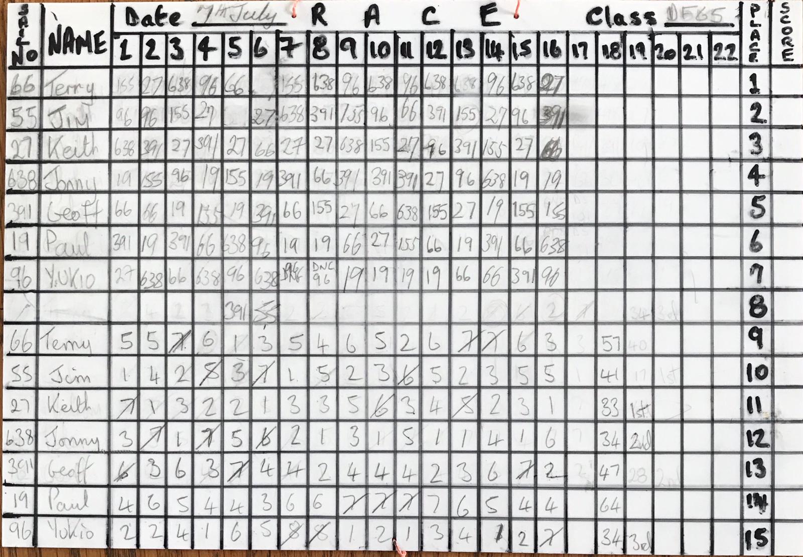 Sunday 7.7.19 DF65 club day , Wind North East 7 mph, Temp a chilly 13’ 7 Skippers today for 16 races from 10-20 through to 2-0 o/c. The first 10 races used a course Start 11&12, 8 p, 13 p, & finish 11&12 , the remaining races with an Easterly Wind used a course Start 13 and Flag, 10 p, 12 s, H p, 13 p and finish 11&12, The wind speed stayed quite constant throughout, just the direction changed, pleased to say no breakdowns all day other than bat flatteries and I must say rather a pleasant days sailing all round. We did find Jonny with his foot stuck firmly in his mouth after suggesting Paul tries A+ sails ( he was already using them ) both marks 10 & H prove very difficult to round ( I’m sure Paul will agree ) we had George on the lake doing some maintenance and do think we could find that obstacle near 13&14 nop ! But thanks to George for all his efforts anyway. So who one the day , we had 1 on 33 points and 2 on 34 points. And the winner is Keith with Jonny 6 wins then Yukio 4 wins both on 34 ,so we’ll done to those girls for such a close competition .