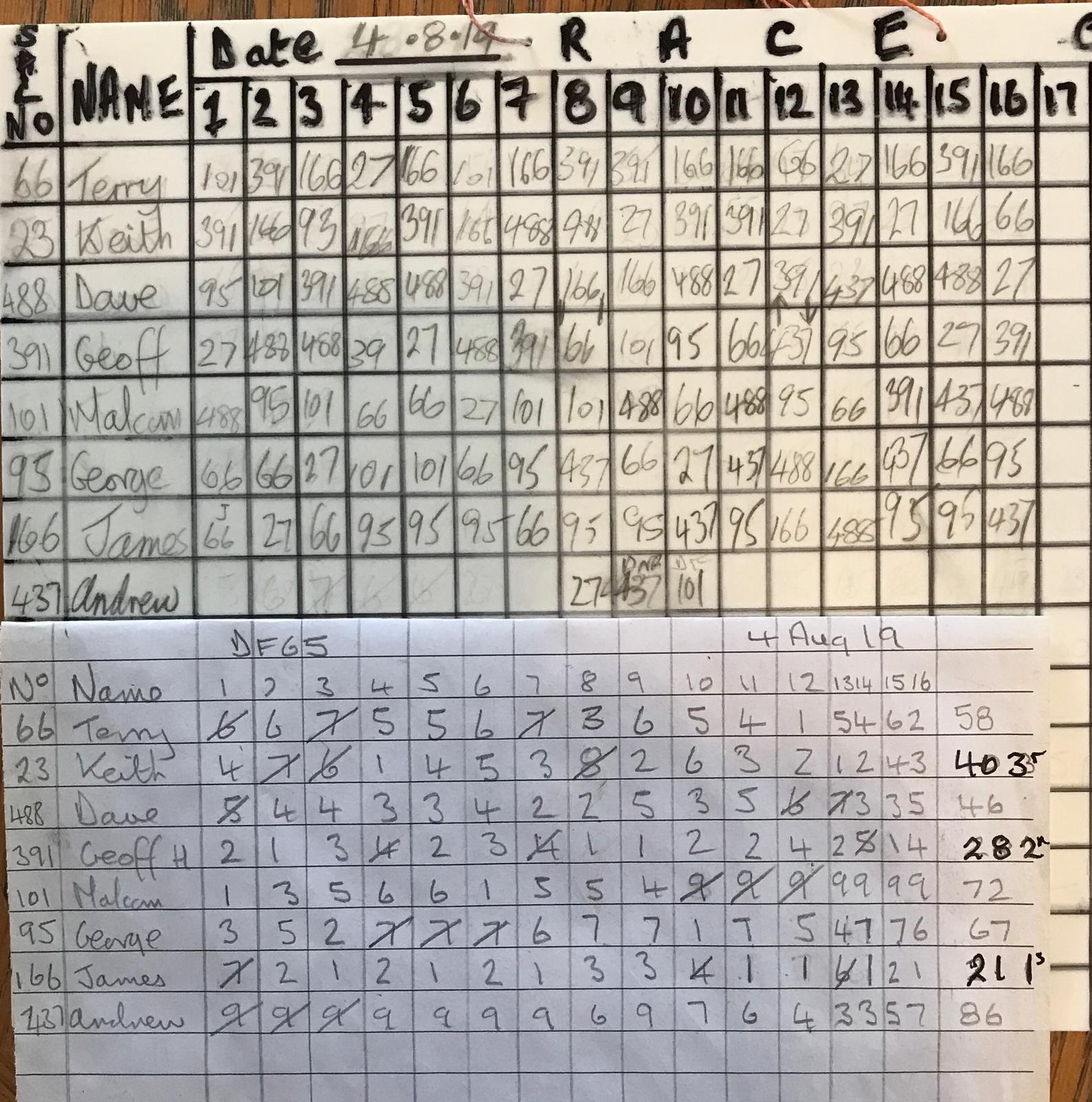 DF65 club day Wind 7-8mph from the South West Temp 28’ in the car park when we left. We had 16 races from 10.30(late due to no wind) through to 14.12 with 8 Skippers 7 on A+ and one on As. On a course set with the start at 6 and the Flag, Hp,6p, and the finish between 8&9. James rocked up about 10.30ish with no gear , we hadn’t started no wind, Someone shoved a tranny in his hand and a boat only on As then he had the audacity to go on and win the meeting
