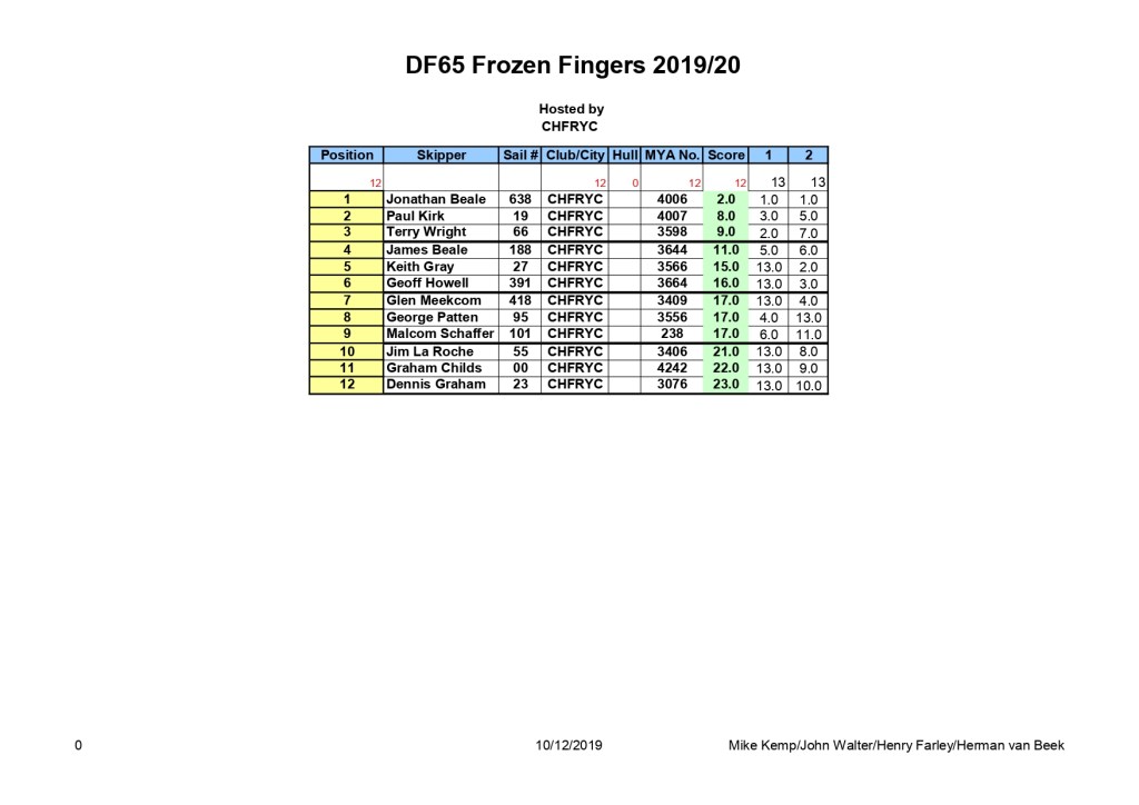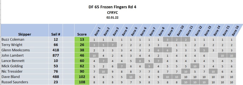 Frozen Fingers Round 4 19.1.20 DF65 Wind none to 10.30 causing a delay ,Temp3’ stepping up to 10‘at close of play, and very sunny. 7 skippers today all using A+ rigs for 16 races through to 2.15pm Allbut one race was on a course start 5&6, 2p,8p, and finish 5&6. The field was quite close as was the result with the top 3 sharing 10 wins between them . No breakdowns as such and that’s always good to report, all penalties were carried out dutifully and promptly without any protest ( well done girls). The days honours went to Jonny on 28 points from Terry on 33 and a tie for third with George edging it on count back from Geoff.