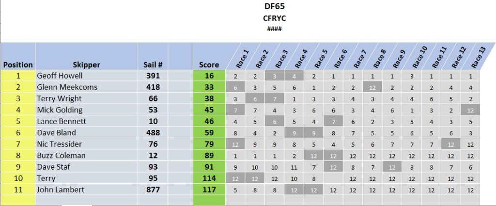 but kept it to within 3 points. So it’s a big congrats all round to Geoff Howell on winning the series ( Mr C ) and to Glenn for giving him a good chase well done to Glenn also. For those not aware the Geoff was presented with a voucher for a set of DF65 sails and rig to his own spec from HD Sails. From me a big thank you for supporting the series an d we’ll see if we can go onward and upwards next year