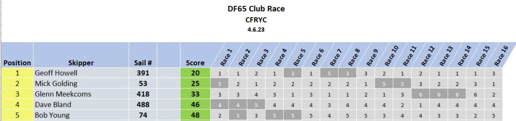 DF65 As you can see 5 skippers today for a very relaxed days racing on C rigs for 12 races in high winds. Geoff Howell battled with Dennis to tie on 16 points but Dennis’s 6 wins against Mr C 4 wins gave him the day and Dave on 27points came third. N.B. Please be aware it’s IOM next Sunday and also there is no IOM this Wednesday 😘