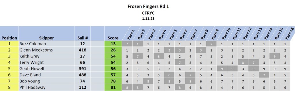 16 races completed before time was called & the skippers could go home to warm their not to frozen bits. All in all a great day’s racing & a lot of fun. Good to see Angela hasn’t lost much speed despite not getting to sail much & noticeable improvement from Jeanette who was never too far behind as she gets to grips with learning to sail.