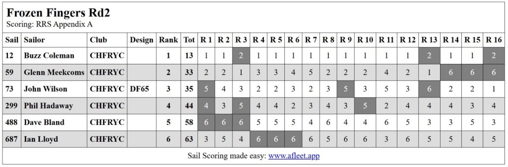 The final round of the Frozen Fingers DF65 championship started off windless & foggy for today’s 6 skippers. Around 10ish some very light wind arrived, it was mostly in a right to left direction, but seemed to come from every direction during each race & disappear completely quite often too. Initial course was; start 7 & bank, 12p, 7p, 12p,7p, finish 12 & bank, sometimes it was 2 laps, sometimes it was 3, but always difficult to judge. 6 races before lunch, a few took 20+ minutes to complete with a mixed bag of results for everyone apart from Buzz.