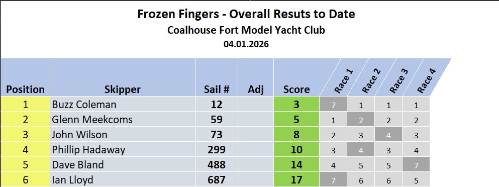 5th Round of the Frozen Fingers for the baby dragons Wind 15- 22 mph Temp 10’ 10 skippers today for 18 races from 10-10 till 2-35 on a course that was change after 3 races to start between 8&9, 12p, Zp, 12p Zp, and finish between the flag and 12. The first course proved to be to difficult to round mark 9 to port with the gust causing to much unavoidable contact for the mere mortals in the fleet and a much better day was had using the newly introduced Z mark. The wind direction lent itself to a couple of routes to the finish line which resulted in some exciting racing with lots of last minute changes to the finishing order. Geoff was first out when he’s TX strap allowed he’s transmitter to drop in a puddle after only 3 races.Terry was next out with water ingress ( poxy purple hull) after only7 races and Yukio missed the last 3 with radio ? Jonny flirted with Bs whilst Geoff stuck it out and took a couple of wins on his Bs. it proved close in the end with both Jonny and Yukio finishing on 27 points , Jonny with 7 wins to Yukio’s 6 took the day “ well done both of you” and James got a good 3 rd place. I thought once we got on the right course it was a good days sport/ racing/ fun even for all 😘