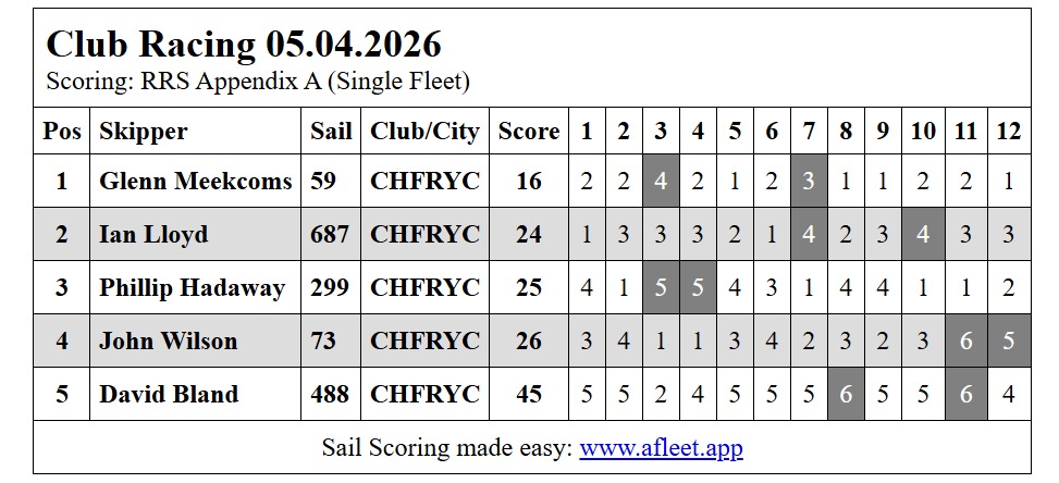 After lunch the course was shortened to; Start 10 & 11, 13p, Xp, finish 13 & 14 to speed up the racing as rain was forecast around 1.30 to 2pm. 16 races completed with the threatened rain holding off & the third discard coming in.
