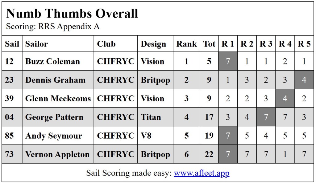 Buzz dominated proceedings with an impressive 11 wins. Dennis sailed consistently throughout the day to secure second place overall, while Andy and Glenn battled hard, squabbling right to the end over the final podium position. Thanks go to everyone who supported the event, contributing to a day of great racing and excellent sportsmanship. (Glenn)