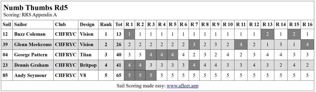 A total of 16 races were completed, just in time to miss the rain. Although Dennis dominated the results with ten wins, the scorecard doesn’t tell the full story: there were plenty of close finishes and some match-racing-style tactics that kept the competition intense and enjoyable all day.