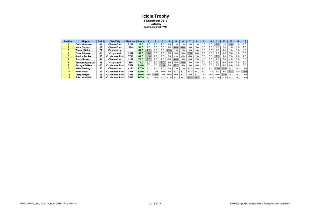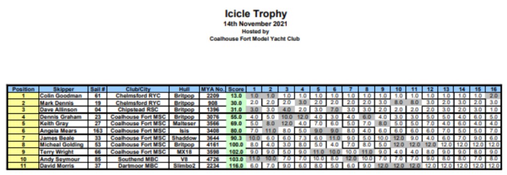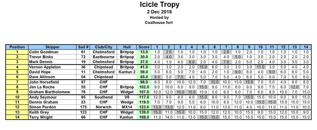 Prize giving was conducted in the car park, once everything was packed away. A well-deserved 4th place went to a pleasantly surprised & pleased Dennis Graham, just reward for having sailed consistently. The battle for second & third place had raged all day, but with the 16th race bringing the 3rd discard into play, it saw Mark Dennis pipping 2nd place from Dave Allison by just 1 point. However, Colin Goodman was the class of the field, winning all but the last race to top the leader board with a mere 13 points from the 16 races, thus retaining the Icicle Trophy for another year. All the prize winners kindly took the opportunity to thank the Coal house Fort club for running the event & their fellow competitors for sailing with such good sportsmanship, all infringements having been dealt with amicably on the water. Glenn Meekcoms.