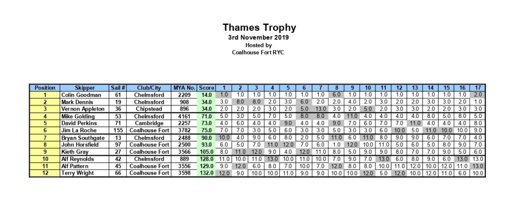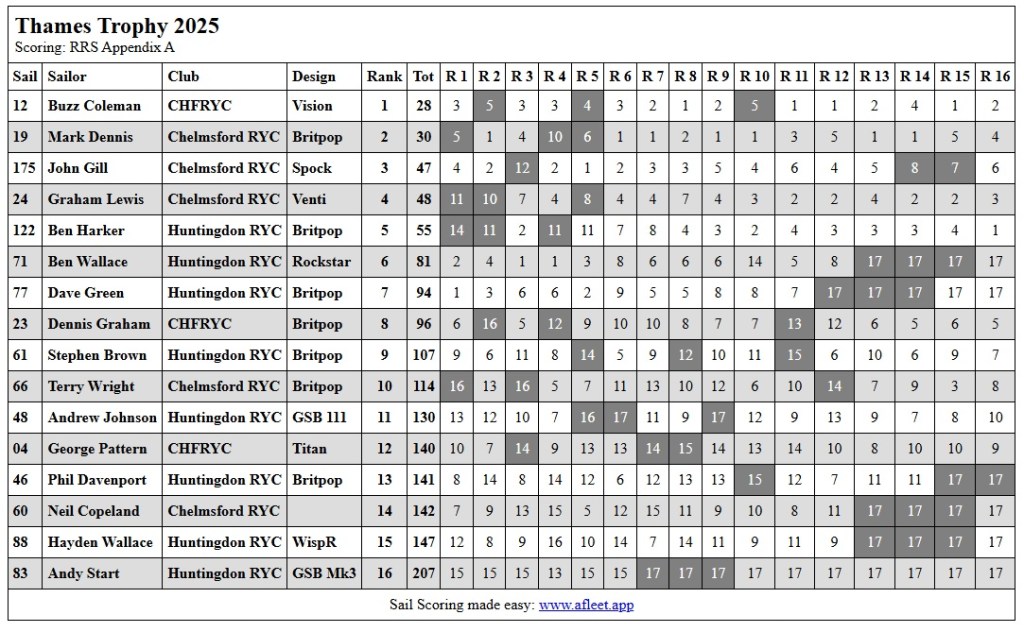 The final scores show just 5 points separating 3rd, 4th & 5th places, then a gap to Dave Green in second, finishing just 4 points behind the winner of this years Thames Trophy, Mark Dennis. Congratulations to Mark on the win & a huge thank you to all who competed for making it such an enjoyable event, & so easy to police for the race team.
