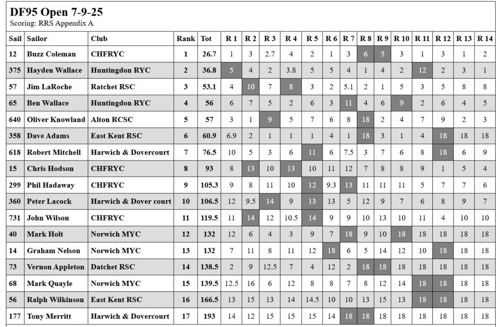 Racing concluded after 14 races, with an eye on the clock and several competitors facing long journeys home. As always, the DF95 class delivered close, competitive racing throughout the fleet and, importantly, maintained the friendly, sporting atmosphere the class is known for.